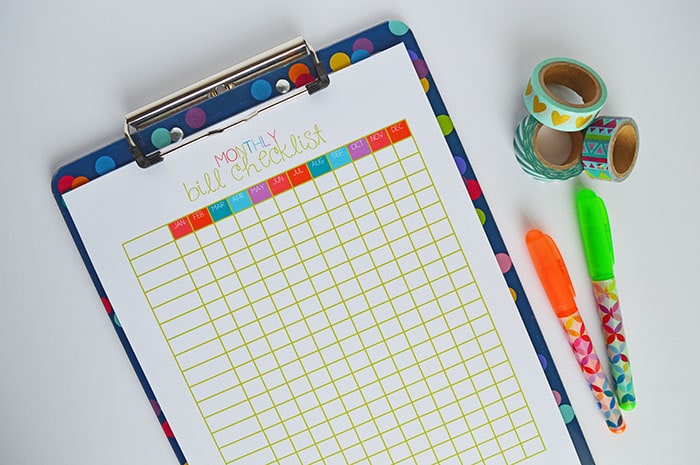 You can use this printable to check off your bills due each month and make sure you don’t miss any payments!