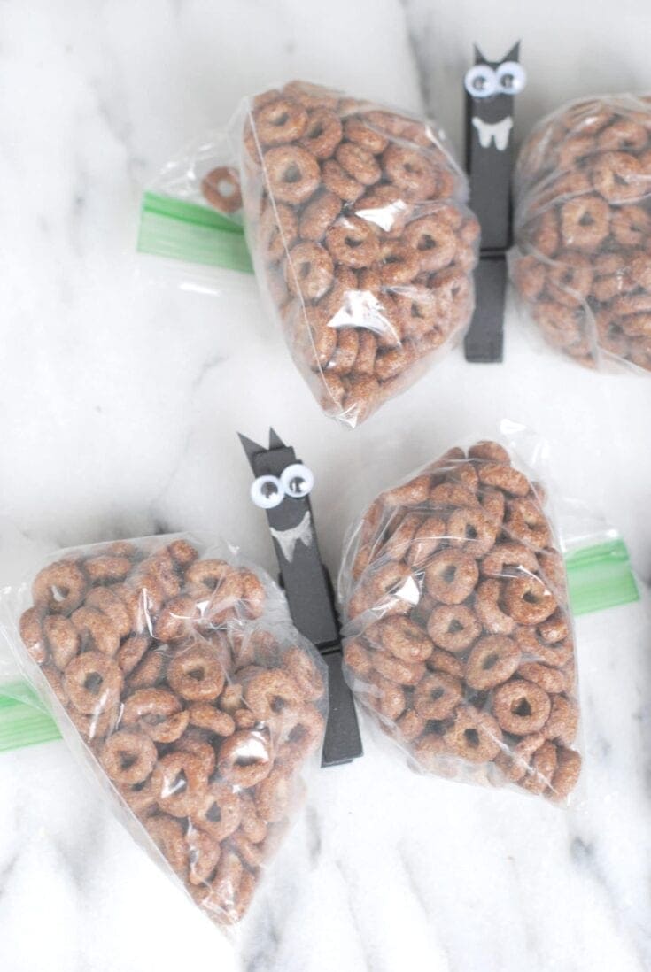 Keep Halloween healthier this year with these adorable Halloween Bat Snacks. Fill baggies with chocolate cereal, add the cute bat clips, and your Halloween snacks are sure to soar.