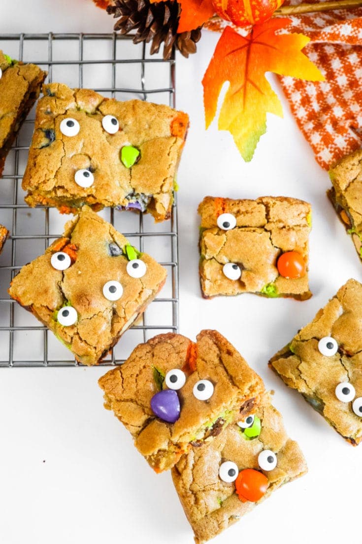 These ghoulish blondies make the most delicious Halloween treat! Combine brown sugar to make a blondie treat. Add candy eyes to make it extra spooky!
