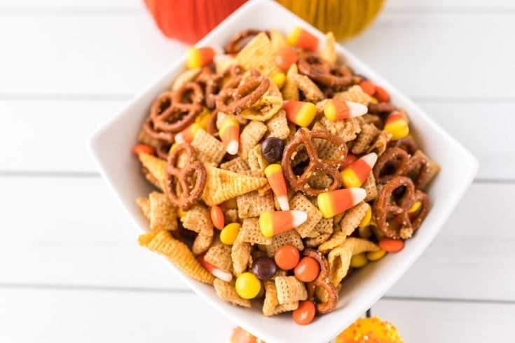 This fall-on-the-go snack is sweet and hard to put down. Some people love the candy corn pieces in their Chex Mix while others simply put them to the side for someone else to enjoy.