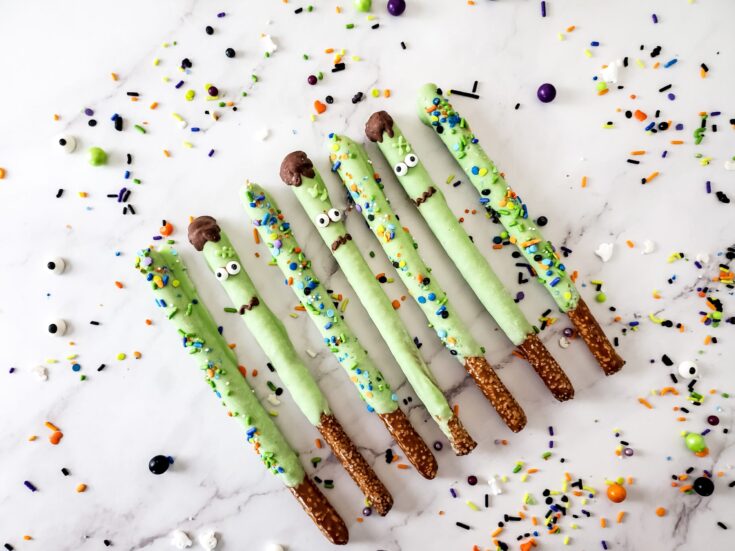 Frankenstein Pretzels are sweet and salty Halloween treats everyone loves. Grab a bag of pretzel rods with candy melts to create the easiest Halloween dessert for your next party.
