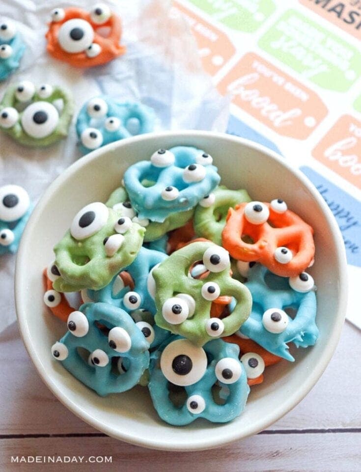 Creepy Monster Halloween Pretzels are a fun easy treat to make with kids. All you need is 3 ingredients! These are perfect for a Halloween party or just a fun snack.