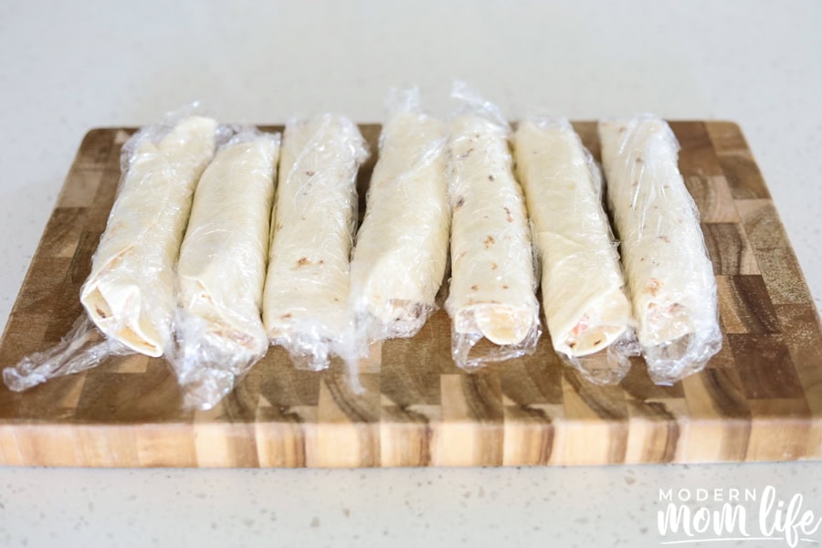 Start rolling the tortilla and roll it tightly towards the top. Place seam side down on the pan. Roll with saran wrap. Repeat with other tortillas. Place in the refrigerator for 30 minutes to 2-3 hours or more to chill. This allows them to become firm and are able to cut easily.