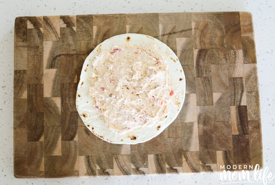 Lay flour tortilla out and spread 1/4 cup evenly over the tortilla. Leave the outer ring free of the mix.