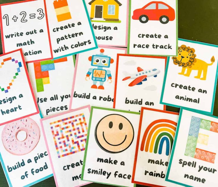 These free printable lego challenge cards are a great addition to your Lego collection to help challenge kids and help with their creative play!