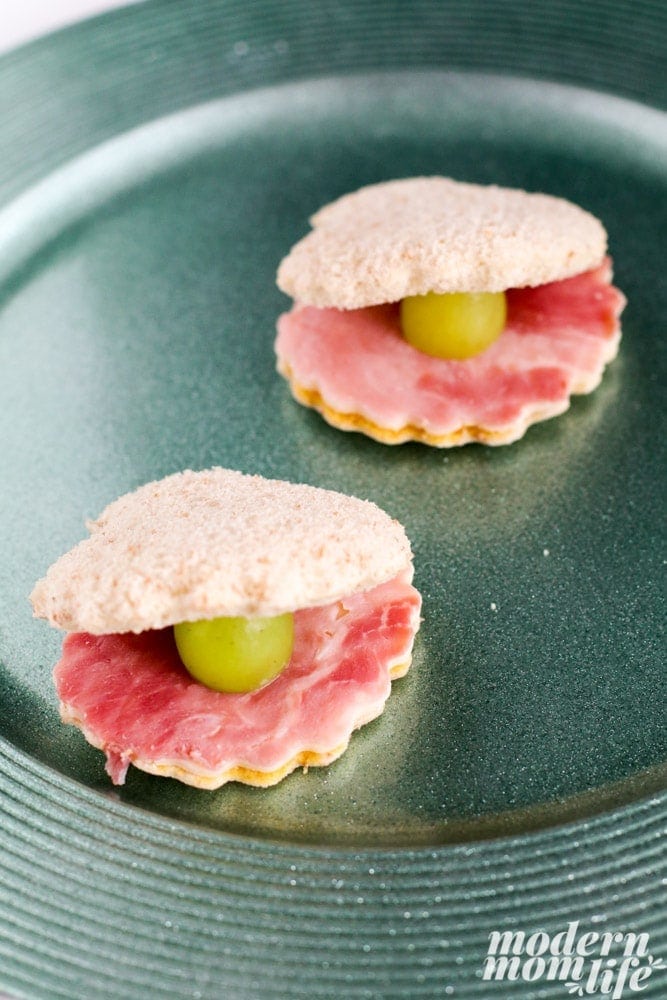 Those are different sandwiches made with sandwich meat (Ham), Cheese and a sliced grape.