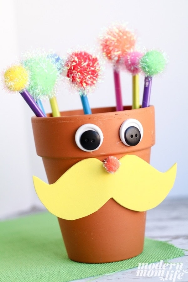 Glue the mustache on the front mid section of the flower pot. Attach a small orange or black pom-pom for his nose.